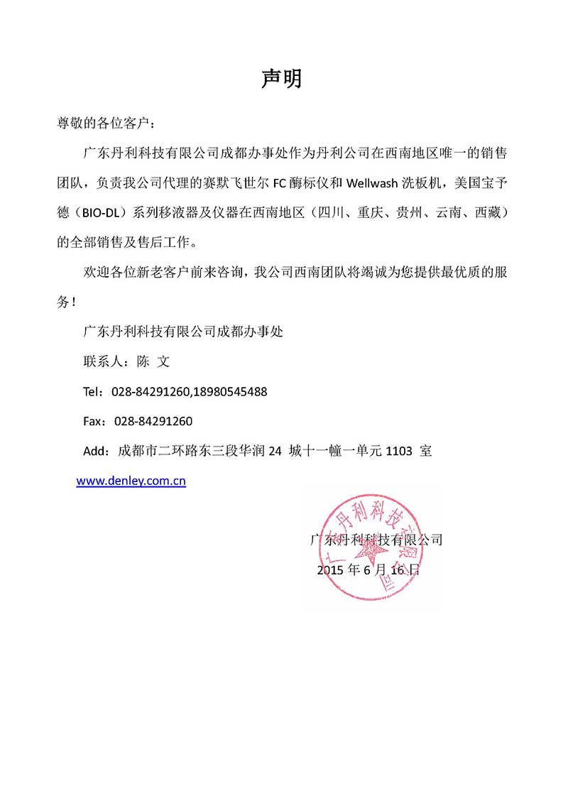 廣東丹利科技有限公司成都辦事處作為丹利公司在西南地區(qū)唯一的銷售團(tuán)隊(duì),負(fù)責(zé)我公司代理的賽默飛世爾FC酶標(biāo)儀和Wellwash洗板機(jī),美國寶予德(BIO-DL)系列移液器及儀器在西南地區(qū)(四川、重慶、貴州、云南、西藏)的全部銷售及售后工作。