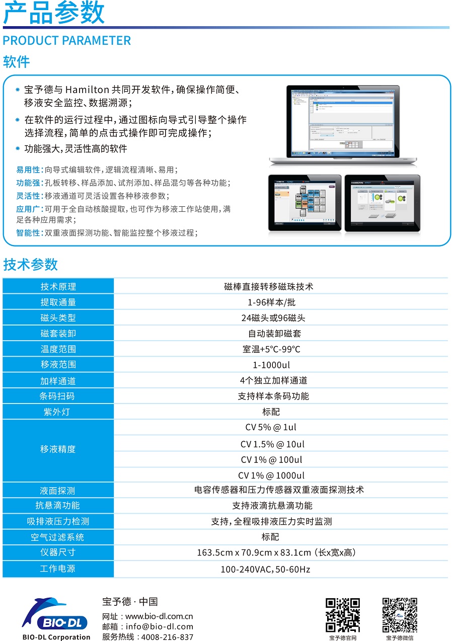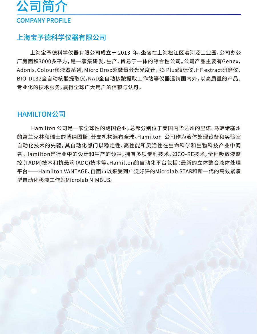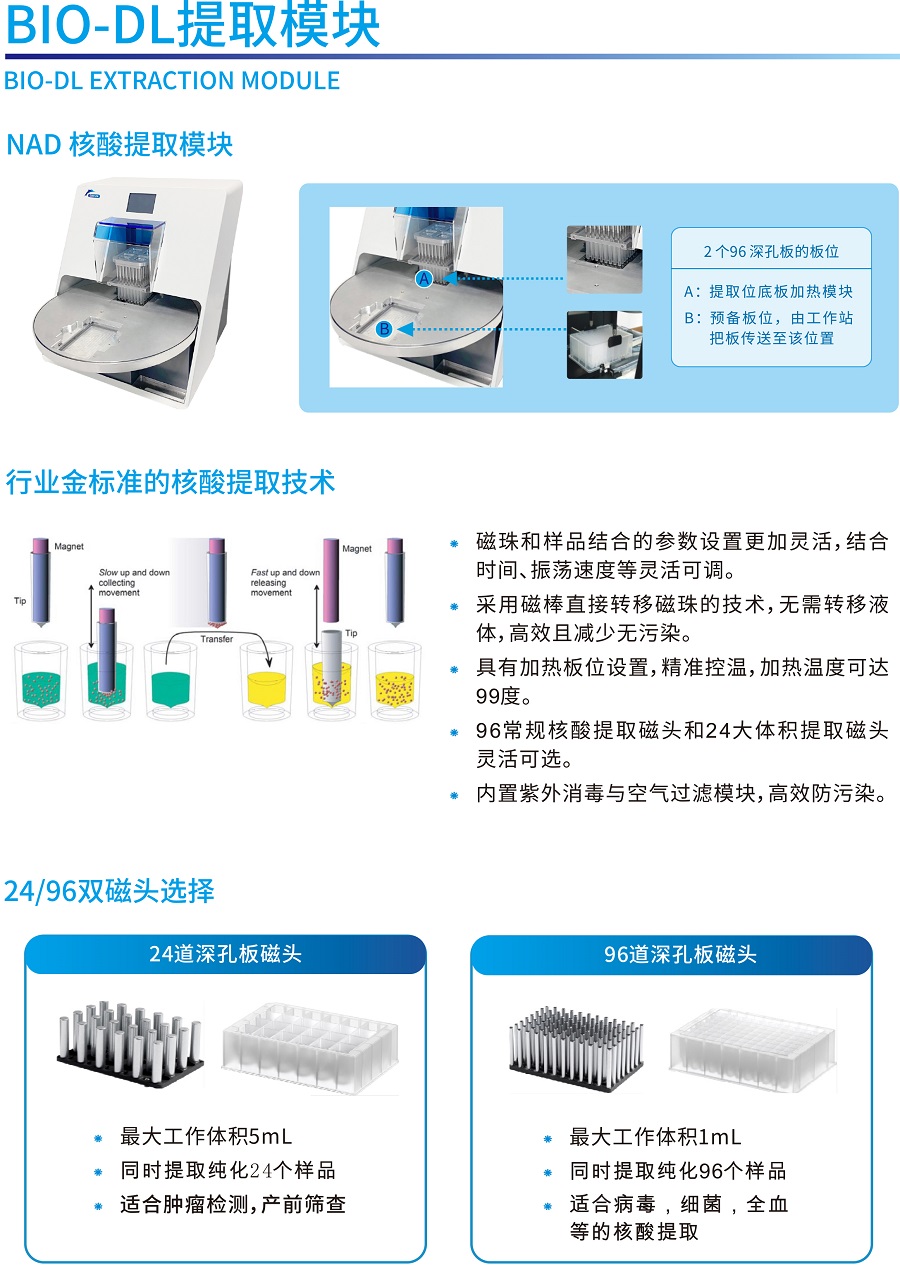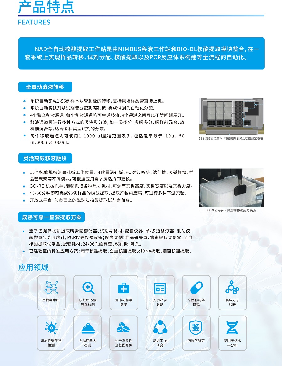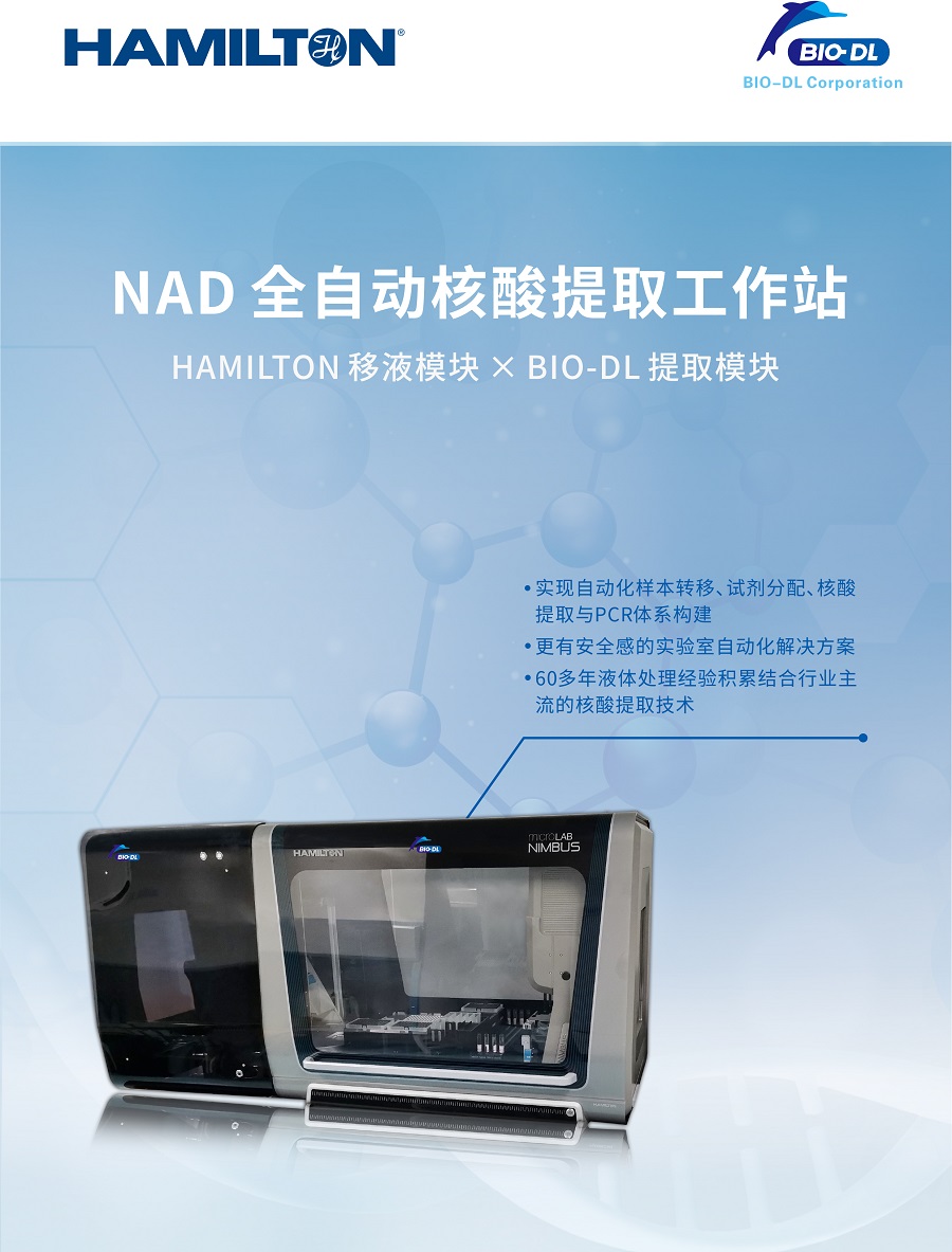 實現(xiàn)自動化樣本轉(zhuǎn)移、試劑分配、核酸提取與PCR體系構(gòu)建;更有安全感的實驗室自動化解決方案;60多年液體處理經(jīng)驗積累結(jié)合行業(yè)主流的核酸提取技術(shù); NAD全自動核酸提取工作站是由NIMBUS移液工作站和BIO-DL核酸提取模塊整合,在一套系統(tǒng)上實現(xiàn)樣品轉(zhuǎn)移、試劑分配、核酸提取以及PCR反應體系構(gòu)建等全流程的自動化。
