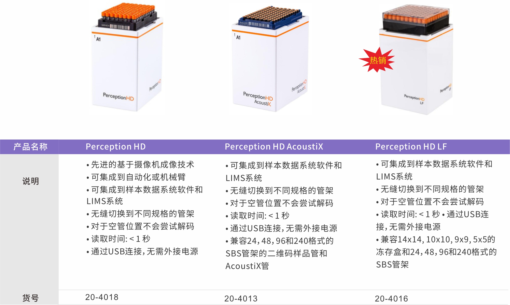 Perception 可快速識(shí)別SBS的管架以及二維碼樣品管,無(wú)需將樣品管從管家上取出即可實(shí)現(xiàn)整版樣品管信息的讀取。該系列讀碼儀不僅可讀取Azenta生產(chǎn)的二維碼樣品管,還可讀取目前市場(chǎng)上所有的二維碼樣品管。可提供三種型號(hào):Perception HD適用于整版SBS格式的管架樣品管掃碼;Perception HD LF適用于整版SBS格式的樣品管和凍存盒格式樣品管的掃碼;Perception HD AcoustiX適用于AcoustiX聲控微量?jī)龃婀艿恼鎾叽a。